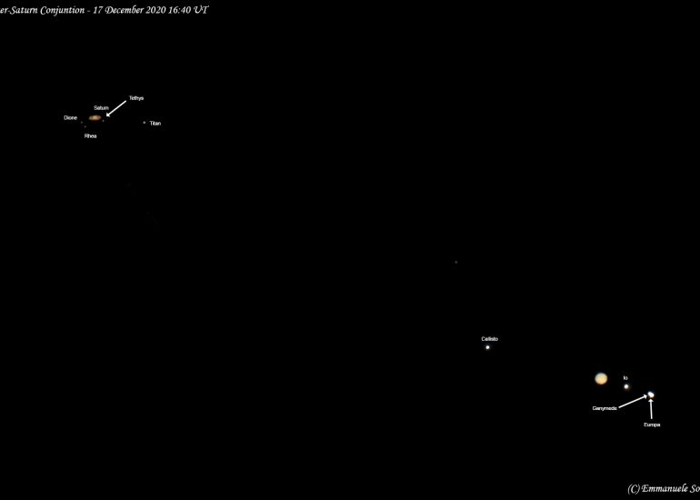 Sfortunatamente, nella seconda metà di dicembre l’Europa Occidentale è stata funestata dal tempo brutto, e l’Italia Settentrionale non si è sottratta a questo destino. Sono riuscito a osservare e riprendere l’evento il 17 dicembre, con i pianeti a circa 29 primi d’arco e tra le nuvole il 18 dicembre, quando i pianeti si trovavano a 23 primi d’arco. Successivamente, una lunga sequenza di perturbazioni mi ha stroncato ogni speranza per tre giorni, incluso il 21.