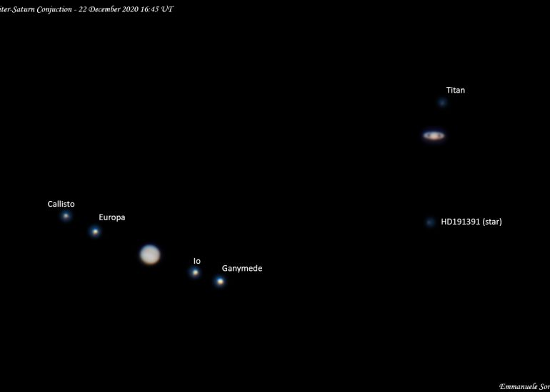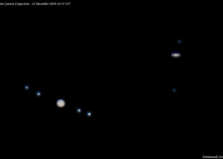 EnglishIn dicembre 2020 si è verificato uno spettacolare fenomeno astronomico: la “grande congiunzione” di Giove e Saturno. Il 21 dicembre i due pianeti si sono trovati a una distanza di 6.1 primi d’arco. L’ultima congiunzione così stretta (meno di 10 primi d’arco) si è verificata nel 1623, mentre la prossima sarà fra circa 60 anni, il 15 marzo 2080. Quindi si tratta di un evento che la maggior parte degli adulti di oggi non vedrà mai più nella propria vita.
