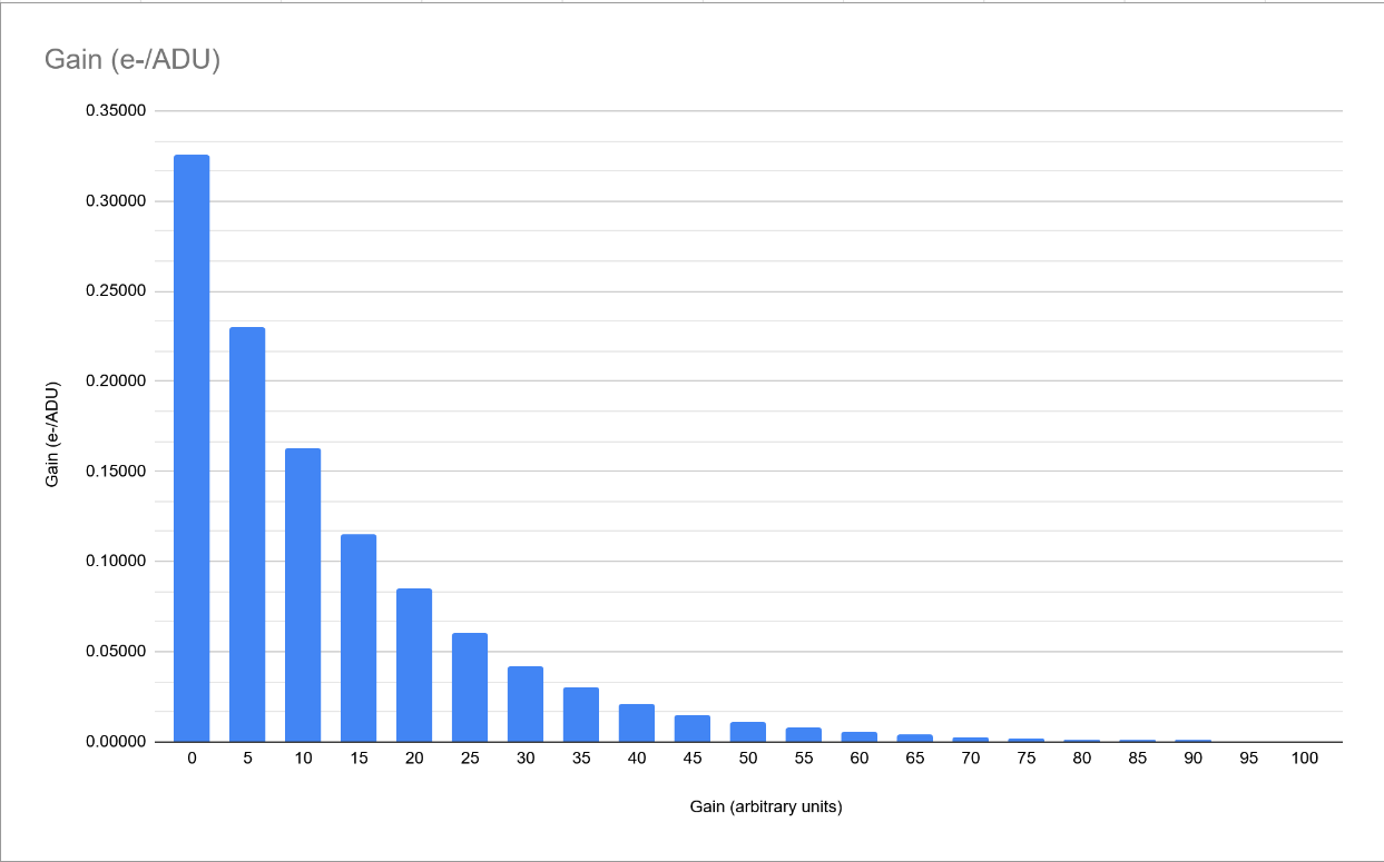 An additional problem is that drivers usually do not allow setting the gain value in actual units (e-/ADU), but instead provide a control (such as a slider) to set the gain value on an arbitrary scale, with ranges greatly varying between cameras and brands and even operating systems..
