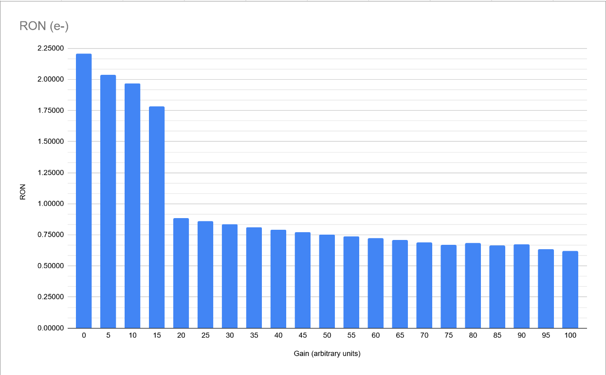 To this end, I acquired a set of flat and bias frames for gain values between 0 and 100 in 5-unit increments (yielding 21 data points) and I measured read noise through this procedure and formula described on Christian Buil’s website.